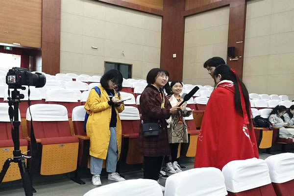 赛场上,我校参赛选手身着明制汉服,活化国学文化元素,瞬间引发全场热议并接受了记者专访,彰显了我校深厚的中华民族传统文化底蕴和专业特色。