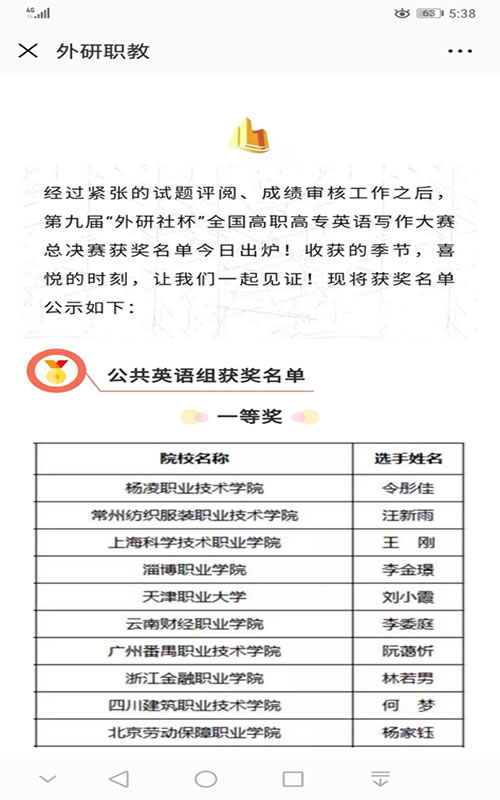 我校学生荣获全国高职高专英语写作大赛一等奖