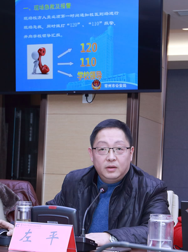最后,所有与会人员一起聆听了市公安局内保支队副支队长左平所作的“高校突发事件处置流程”专题讲座。