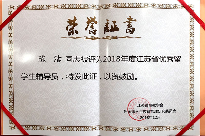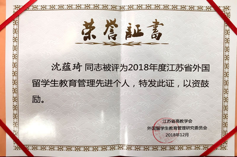 2019年1月17日,江苏省高等教育学会外国留学生教育管理研究委员会2018年年会暨年终总结表彰大会在徐州召开,我校国际学院沈蕴琦老师获2018年度江苏省外国留学生教育管理先进个人荣誉称号,陈洁老师获2018年度江苏省优秀留学生辅导员荣誉称号。图/文:陈洁;审核:杨善江