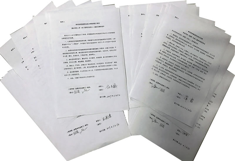 随后,服装学院组织科级干部、重点岗位人员、重点建设项目负责人举行了廉洁自律承诺书签订仪式。承诺书要求每位关键岗位人员严格要求自己,率先垂范,做遵纪守法的榜样和道德操守的楷模。本次廉洁自律承诺书的签订进一步增强了重点部门和重点项目负责人的廉洁风险意识和抵御风险的能力。