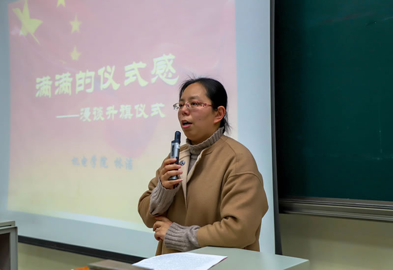 启动仪式结束后,林洁做第一讲《满满的仪式感——漫谈升旗仪式》。她通过阐述中国国旗的由来,“你所不知道的天安门升旗常识”,介绍《中华人民共和国国旗法》、《中华人民共和国国歌法》等相关法律,让学生加深了对国旗历史意义的了解,强调了在国旗升起、国歌奏响时正确礼仪要求。