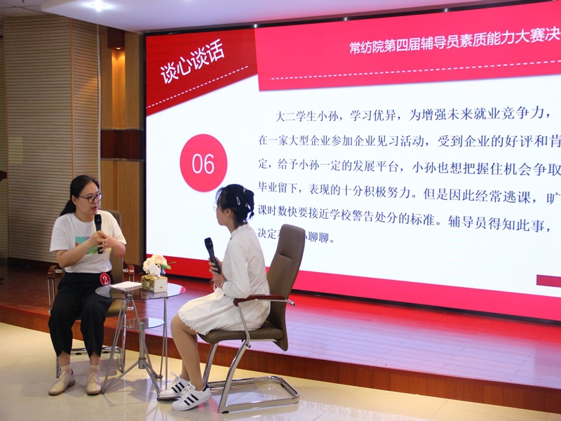 此次决赛分为理论宣讲、谈心谈话两个环节进行。理论宣讲环节主要考察辅导员对大学生开展理想信念教育、中国特色社会主义和中国梦宣传教育、社会主义核心价值观教育过程中的理论宣传阐释能力,注重考察理论宣讲的政治性、思想性、理论性、政策性、导向性。参赛选手现场提前20分钟抽题,围绕马克思主义理论、习近平新时代中国特色社会主义思想等,运用“思政语言”对大学生开展宣讲,体现“思想政治辅导员”的身份属性。谈心谈话环节要求参赛辅导员根据题目要求,在限定的6分钟内以情景再现的方式开展谈心谈话,对学生进行正面引导,解决学生反映的问题,内容涉及学生就业指导、学生违纪、恋爱交往、价值引领、心理疏导等方面,主要考察辅导员对相关理论政策、学生特征、对问题的解决能力和对学生的教育引导能力。比赛中,选手们认真倾听学生的问题并真诚地与学生互动交流,结合自身实际经历,引用他人事例,充分展示了选手的热情、耐心与睿智。