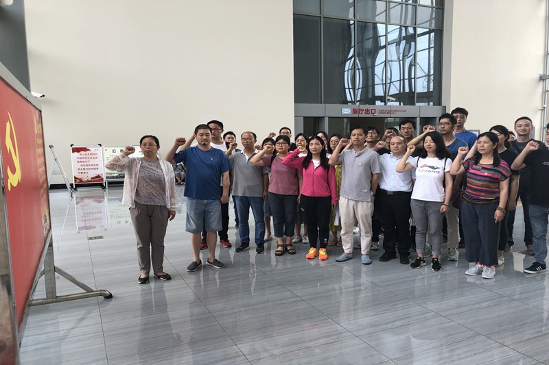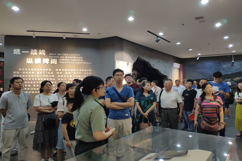 在新四军黄桥战役纪念馆新馆内,党员们通过鲜活的照片、珍贵的物件、详细的史实全面了解了黄桥战役的历史风云,深切体会陈毅、粟裕、陈丕显等革命先辈们对马克思主义的信仰,运筹帷幄、不怕牺牲、奋勇杀敌的革命精神。在机电学院党总支书记林洁的带领下,党员们在鲜红的党旗下,再次举起右手,重温入党誓词。