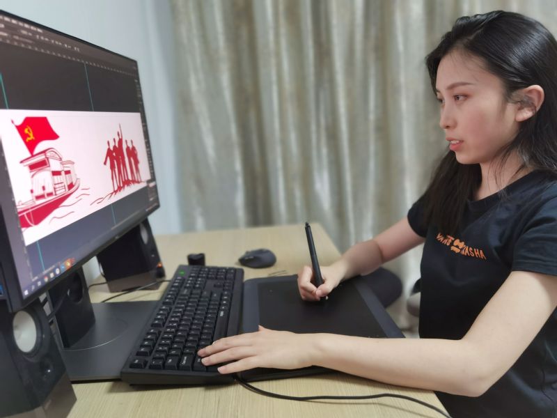 作为“巾帼心向党·奋斗新征程”百米长卷设计者,进行图案创作