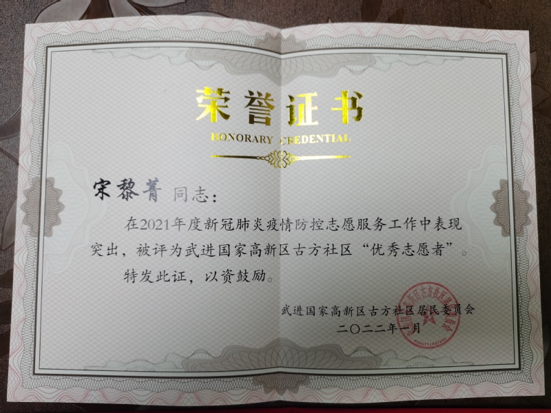 积极参与社区疫情防控志愿者工作,做好小区门岗进出人员和车辆的行程码和健康码查验以及测温工作。2021年获武进国家高新区古方社区疫情防控优秀志愿者。