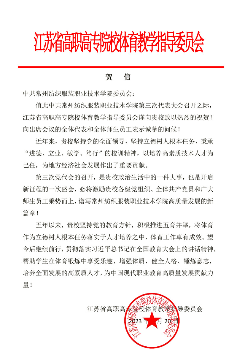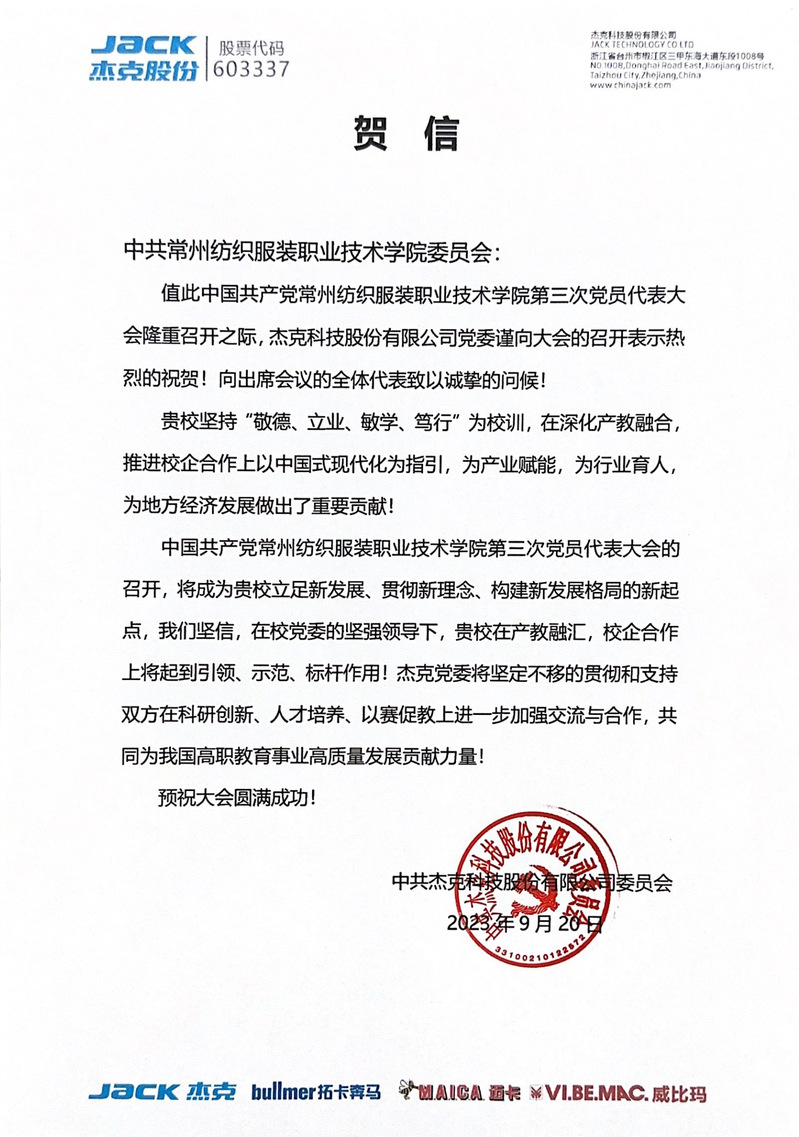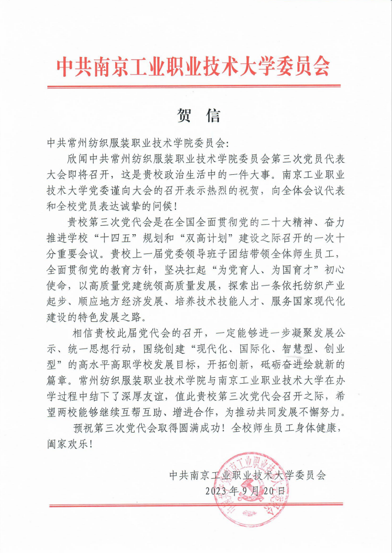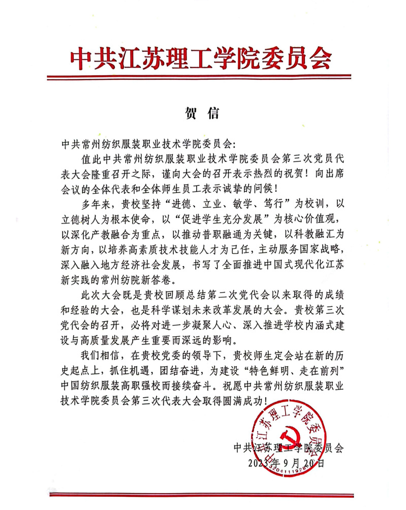 值此盛会之际,江苏理工学院、南京工业职业技术大学等16所高校,江苏省纺织工程学会等3家行业协会,红豆集团有限公司、杰克科技股份有限公司等14家合作企业来贺信向我校全体党员和广大师生员工表示祝贺,祝贺大会胜利召开。