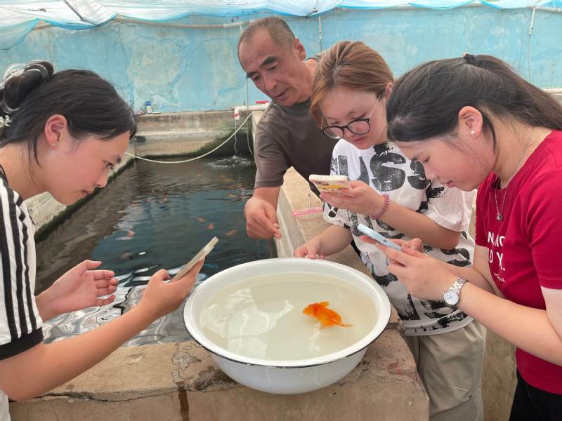 田大海分享了两代人五十余年的养殖历程:从最初的技术摸索到如今形成标准化养殖体系,他用坚守与创新让四腮泡金鱼成为洑家村的文化名片。“保护和传承这一特色品种,不仅是为了延续传统,更是希望通过产业发展让更多人了解金鱼文化的独特魅力,让这一文化绵延不断。”田大海的话引发了实践团成员的强烈共鸣。