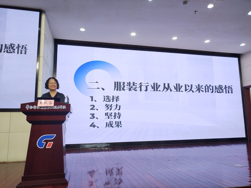 特邀校关工委委员、学院党总支原书记潘荷新与新生话成长,他以学校的发展历程为引,带领新生们穿越时光,生动再现了学校自1958年从常州纺织工业专科学校的初创,到全国重点中专,再到2001年升格为高职院校以及到成为省双高计划建设单位以来筚路蓝缕的创业历程、砥砺前行的发展足迹和硕果累累的辉煌成就。他深情地讲述着学校在曲折中前行,在改革中腾飞的故事,让新生进一步增强了对学校的归属感、认同感和自豪感。学院特邀江苏圣澜服饰创意有限公司董事长、“同桌的你”品牌创始人王秋芬女士开展分享会。她结合自身创业经历,深入分析行业趋势与发展机遇,鼓励新生培养创新思维和市场意识,为未来职业发展与自主创业积累经验。
